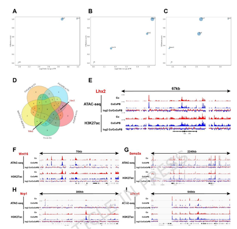 靶点筛选:ANANSE 算法整合多组学数据,锁定 Lhx2 为 CePB 调控骨再生的关键转录因子(图 11A-C),其基因座的染色质可及性和 H3K27ac 修饰显著升高(图 11E);