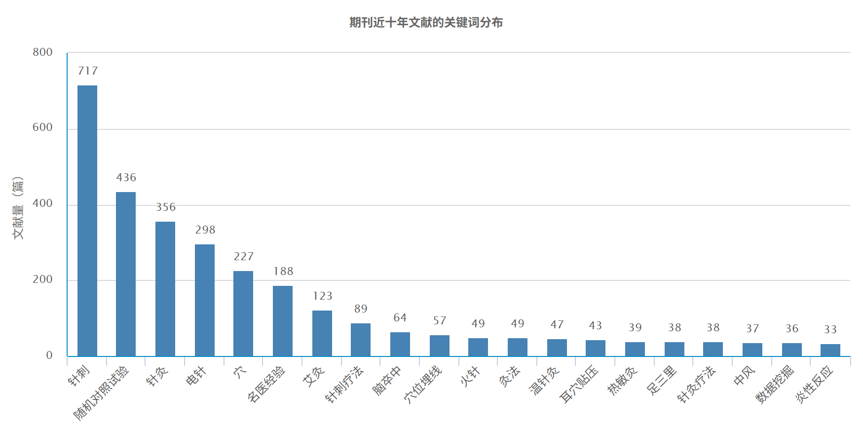 在该期刊中,"针刺"栏目的发文量最高,其次是"随机对照试验"、"针灸"、"护理"、"电针"等。