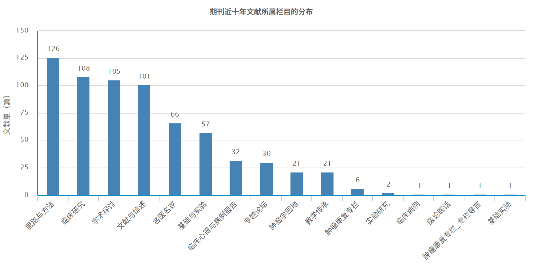 在该期刊中,"中医药"栏目的发文量最高,其次是"肝癌"、"肺癌"、"化疗"、"肿瘤"等。