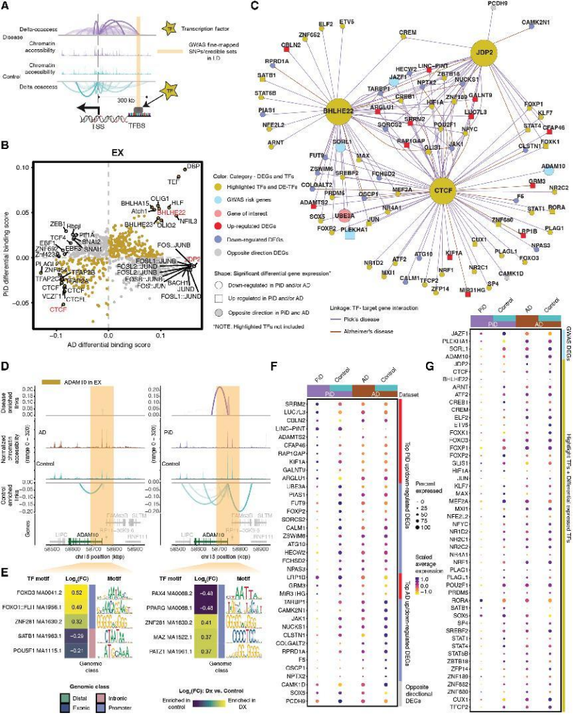 兴奋性神经元:PiD 中 TF 下调更显著(如 CTCF、BHLHE22),AD 中特有 JDP2(凋亡相关 TF)上调;共享 TF 如 RORA(能量代谢相关)在两者中均上调(图3B、G);