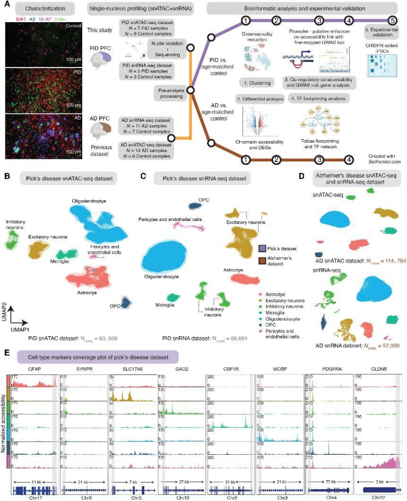 样本覆盖:7 例 PiD 患者、12 例晚期 AD 患者、17 例认知正常对照,采集前额叶皮层(PFC)组织,完成 snATAC-seq(捕获 19.8 万 + 细胞核)和 snRNA-seq(捕获 12.4 万 + 细胞核)(图1A);