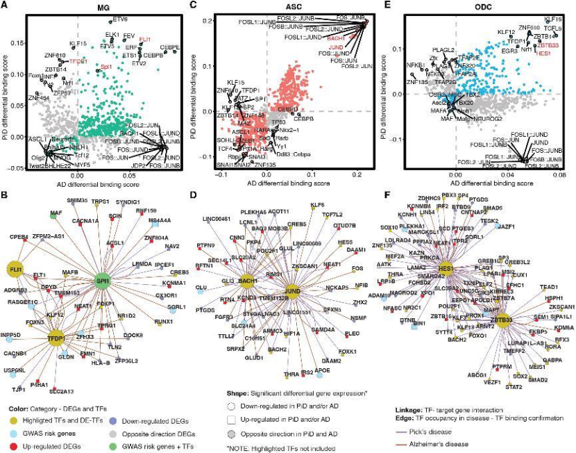 解析两种疾病中神经元与胶质细胞的转录因子(TF)结合差异,揭示 tau 病调控共性与特异性: