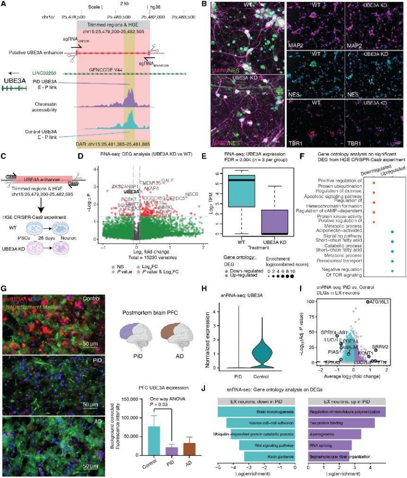 关键发现:PiD 患者兴奋性神经元中,UBE3A 的一个远端人类特异性增强子(HGE)染色质可及性显著升高,但 UBE3A 转录水平却下调(图2A、H),提示 “染色质开放代偿性调控”;