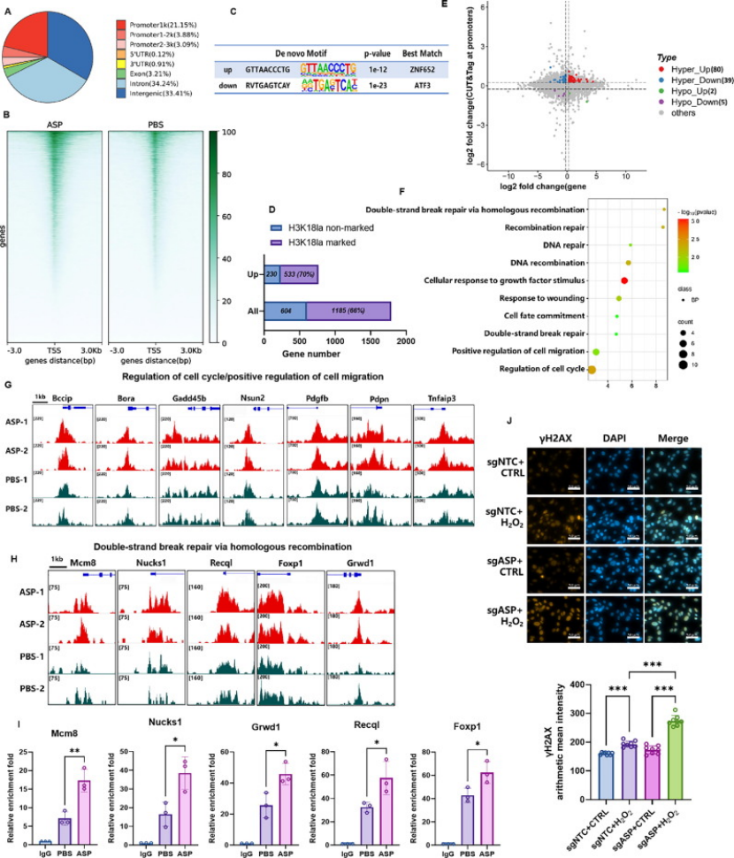关键靶基因验证:关键 DNA 修复基因(Mcm8、Nucks1、Recql)和细胞周期调控基因的启动子区,H3K18la 富集显著增加,CUT&Tag-qPCR 进一步验证该结果;且 Asprosin 敲除会加剧 H2O2 诱导的 DNA 双链断裂,损害 MSC 的 DNA 修复能力(图 8G-J),明确H3K18 乳酸化是 Asprosin 介导 MSC 表观年轻化的核心靶点。
