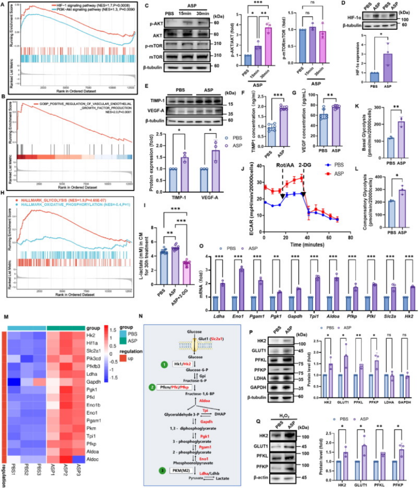 GSEA 转录组分析锁定核心通路:Asprosin 可显著激活 PI3K/AKT-HIF-1α 信号通路,且正向调控 VEGF 生成(图 5A-B);