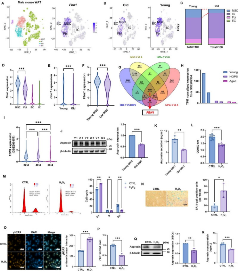 跨物种(鼠 / 大鼠 / 人)单细胞测序分析显示,MSC 是 Fbn1/FBN1 的主要表达细胞,而非既往认为的脂肪细胞,且衰老会伴随 MSC 耗竭及 Fbn1 的特异性下调(图 2A-F);