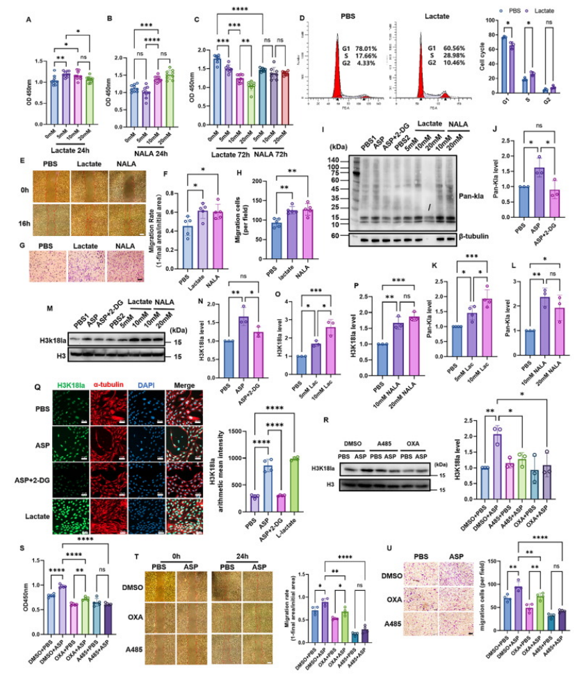 乳酸化修饰验证:Asprosin 能显著升高衰老 MSC 的全蛋白赖氨酸乳酸化(pan-Kla)和 H3K18 乳酸化(H3K18la)水平,2-DG 可完全阻断该效应;乳酸生成抑制剂草酸钠(OXA)或 p300(乳酸化 “写入酶”)抑制剂 A485,能逆转 Asprosin 诱导的 H3K18la 升高,同时消除其对 MSC 增殖、迁移的促进作用(图 7I-U);