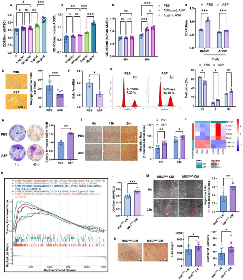 重组蛋白验证:真核表达的重组人 Asprosin(需翻译后修饰才具备生物活性),呈剂量依赖性促进鼠 / 人骨髓 / 脂肪来源 MSC 的增殖,有效逆转早衰 MSC 的衰老表型、下调衰老标志物 p21、改善细胞迁移能力;转录组和 GSEA 分析显示,Asprosin 可激活细胞周期、DNA 修复、端粒维持等核心通路(图 4A-K);