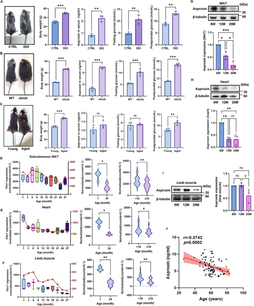 动物模型发现,年轻肥胖小鼠循环 Asprosin 随脂肪量升高而增加,但老年肥胖小鼠无此趋势,且老年小鼠多组织(腹股沟脂肪、心脏、肢体肌肉)Fbn1 转录和 Asprosin 蛋白水平均显著下调(图 1D-I);