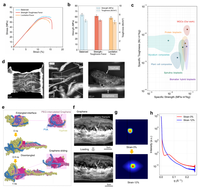 图4 菌丝-石墨烯复合材料的力学验证与界面机理。(a)三种从预测帕累托前沿不同区域选择的MGC配方的应力-应变曲线:平衡型(蓝色)、强韧优先型(红色)和悬浮优先型(橙色)。每种配方对应帕累托集学习模型导出的特定偏好向量。(b)三种代表性样品的拉伸强度与韧性对比。(c)阿什比图将MGCs的比强度和比韧性与代表性生物基复合材料(包括菌丝、蛋白质、植物细胞、螺旋藻和混合生物塑料)进行对比。MGCs占据了一个在两个指标上同时提升的独特区域,突显其力学效率。(d)聚焦离子束透射电镜图像显示石墨烯纳米片与真菌菌丝之间形成了分级缠结、钉扎-桥接的界面。(e)分子动力学模拟显示聚乙烯醇-菌丝界面内应变诱导的解缠与石墨烯滑移。(f)MGCs的原位拉伸扫描电镜表征。实时变形揭示了在载荷作用下石墨烯拔出、聚合物-菌丝原纤化和渐进式界面脱粘。这些特征直接验证了负责所观察到的强化和增韧行为的动态纳米片钉扎滑移机制。(g)在0%和12%应变下的二维小角X射线散射图样,显示变形后各向异性增强。(h)对应的一维小角X射线散射强度曲线,拉伸后低散射矢量区域散射增强,表明纳米尺度结构重排。