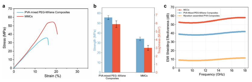 图6 生物界面构建策略的普适性验证。(a)传统共混聚乙烯醇-聚乙二醇-MXene复合材料与菌丝-MXene复合材料的应力-应变曲线,表明生物组装产生物理共混中不存在的增强结构。(b)拉伸强度与韧性的定量比较,显示MMCs同时实现了高强高韧,从而规避了经典的强度-韧性权衡。(c)MMCs、聚乙烯醇-聚乙二醇-MXene复合材料和未添加MXene的菌丝-聚乙烯醇复合材料在8-18 GHz范围内的电磁干扰屏蔽效能。MMCs表现出优异的结构韧性和电磁干扰衰减,证实生物界面策略可推广至石墨烯以外的其他类二维纳米材料。