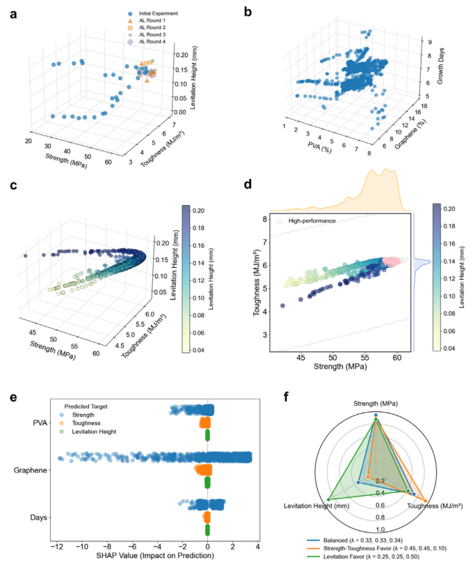 图3 机器学习引导的多目标优化结果。(a)四轮主动学习迭代中候选解的演化,显示出向高强度、高韧性和高悬浮高度的逐步收敛。(b)经过四轮主动学习后,帕累托最优解在组成空间中的分布,包括聚乙烯醇含量、石墨烯比例和培养时间。(c)预测性能空间中帕累托前沿的二维投影,颜色表示悬浮高度。(d)由帕累托集学习结合主动学习生成的帕累托前沿,与初始预测相比覆盖范围显著扩大。(e)沙普利加性解释分析显示组成和工艺变量对强度、韧性和悬浮高度的相对贡献。(f)在用户定义偏好向量引导下,从帕累托前沿不同区域选择的三组代表性配方,其性能指标以雷达图形式展示,表明性能特征可根据设计优先级进行定制。