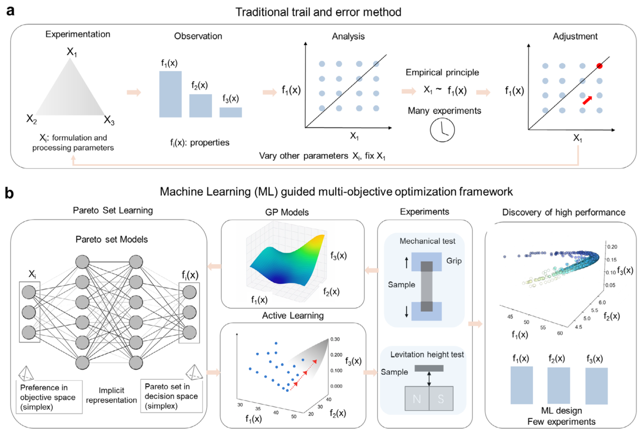 图2 传统试错设计与机器学习引导的多目标优化对比。(a)传统的试错法和实验设计依赖于对配方和加工条件的穷举和均匀采样。即使对于三变量系统,这些策略通常也需要数百次实验,通常每次只改变一个因素。这类传统方法测试了许多远离最优区域的组成,产出有限的可操作见解。在菌丝基复合材料中,每次实验需要数天的生长和密集加工,这种低效变得不可接受,且无法捕捉强度、韧性和悬浮性能之间的非线性、多目标权衡。(b)基于机器学习框架集成了高斯过程回归、偏好引导的帕累托集学习和主动学习,以高效探索设计空间。该模型不是均匀扫描所有组合,而是基于性能偏好向量生成候选配方,并迭代选择信息丰富、高价值的解。这种引导搜索显著减少了实验负担,加速了向高性能区域的收敛,从而能够快速识别传统方法无法企及的最优配方。