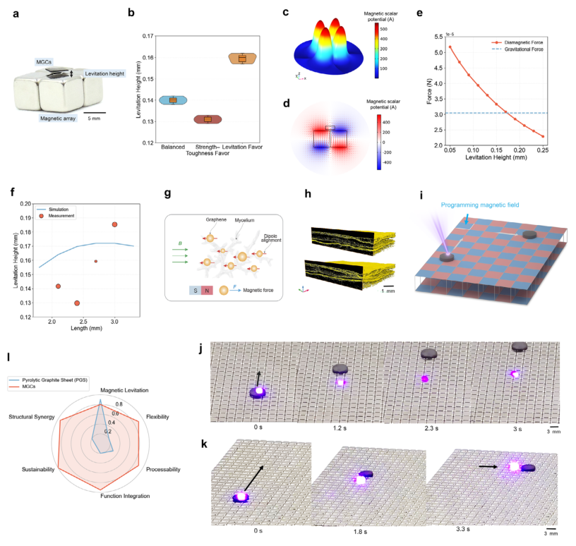 图5 MGCs的磁悬浮与可编程运动。(a)平衡型MGC板在永磁阵列上方悬浮的光学照片。悬浮高度定义为磁体表面与MGC底面之间的垂直气隙,使用激光距离传感器测量。(b)三种通过帕累托引导设计策略优化的MGC组悬浮高度的小提琴图。悬浮导向配方达到最高悬浮高度,证实了功能性能的可调性。(c)磁标量势场的有限元模拟,显示产生垂直斥力的四峰约束场。(d)模拟的二维截面场分布,矢量箭头表示作用在悬浮MGC板上的向上抗磁力。(e)3 mm板悬浮力与距离的模拟关系,指示与重力平衡的平衡位置。(f)不同尺寸方形板(厚度约0.6 mm)悬浮高度的模拟与实验测量对比。圆圈大小表示误差范围。(g)复合材料中偶极子排列示意图:石墨烯纳米片和菌丝区域形成偶极响应网络,与外部磁场相互作用,产生向上的抗磁力。(h)MGCs的X射线显微断层扫描重建,显示具有互锁菌丝-石墨烯区域的各向异性层状结构。(i)可编程磁阵列上激光诱导驱动的示意图。局部激光照射引发MGC板的悬浮运动,而在相邻磁体之间引入间隙可重构磁场分布为约束势阱。光热驱动与各向异性磁约束的耦合实现了可编程轨迹控制。(j)局部激光照射下MGC板在磁阵列上的悬浮和引导平移的时序光学图像。(k)激光照射下MGC驱动器的代表性轨迹,展示可控位移和转向。照射位置定义起始点,而间隙调制的磁场模式引导平移和转弯行为。(l)MGCs与商用热解石墨片的多功能性能雷达图。归一化指标对磁悬浮、柔韧性、可加工性、功能集成性、可持续性和结构协同性进行基准测试。PGS因其各向异性电子结构表现出强悬浮性,但柔韧性、可加工性和可持续性有限。相比之下,MGCs展现出均衡的多功能特性,以及源自生物辅助界面的优异适应性和结构协同性。