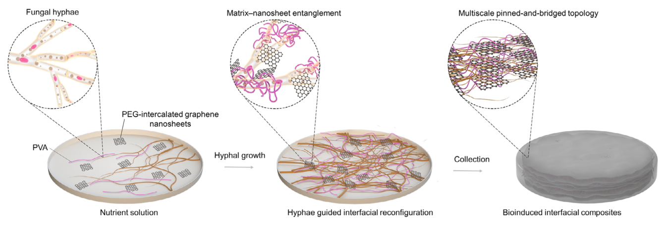 图1 生物辅助构建纳米片-聚合物界面。真菌菌丝引导界面结构化的示意图。在含有聚乙二醇插层石墨烯纳米片和聚乙烯醇的富营养聚合物溶液中,接种的菌丝增殖并与聚合物链和纳米片相互缠绕。这种生长驱动的重构形成空间限域和多尺度缠结,构建出钉扎-桥接的界面拓扑结构。所得的生物杂化网络经收获和干燥后形成坚固的纳米复合材料。