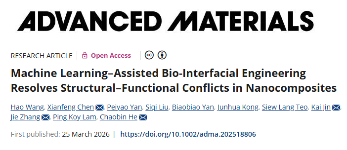 近日,新加坡国立大学何超斌教授、太原理工大学张杰教授、中国海洋大学靳凯副教授、新加坡科技研究局Chen Xianfeng博士等合作,提出了一种机器学习辅助的生物界面设计框架,成功解决了这一长期存在的“结构-功能冲突”。该研究通过将高斯过程代理模型、帕累托集学习(PSL)与主动学习(AL)相结合,在不到60次实验的迭代内,便实现了相较于传统方法74%-85%的实验次数、项目周期和成本的缩减,极大地加速了高性能多功能纳米复合材料的发现与设计流程。相关论文以“Machine Learning–Assisted Bio-Interfacial Engineering Resolves Structural–Functional Conflicts in Nanocomposites”为题,发表在Advanced Materials上。