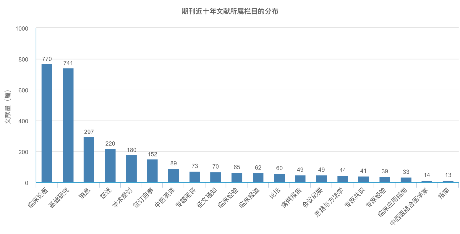 在该期刊中,"中西医结合"栏目的发文量最高,其次是"中药复方"、"随机对照试验"、"中医药"、"中药"等。