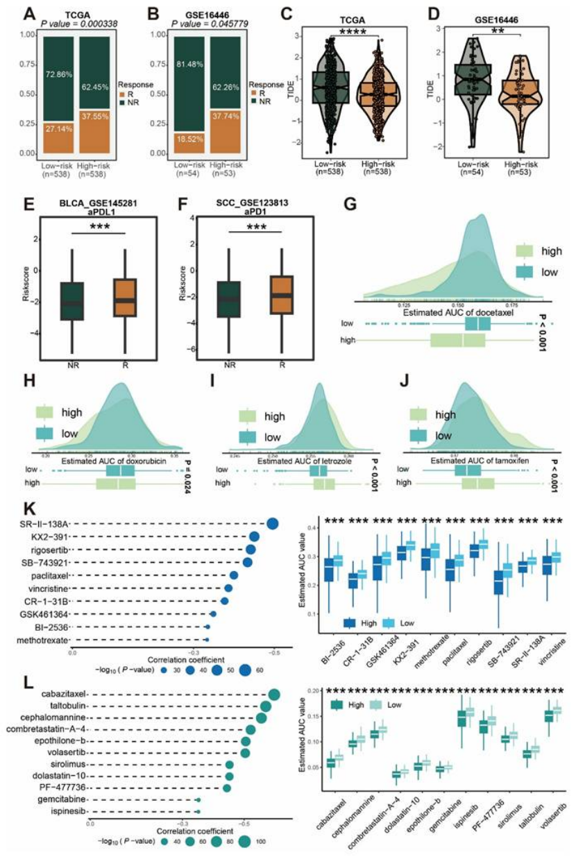 治疗指导:高风险组对免疫治疗更敏感,且对多西他赛、多柔比星等化疗药敏感;低风险组对来曲唑、他莫昔芬更敏感(图9A-J)。