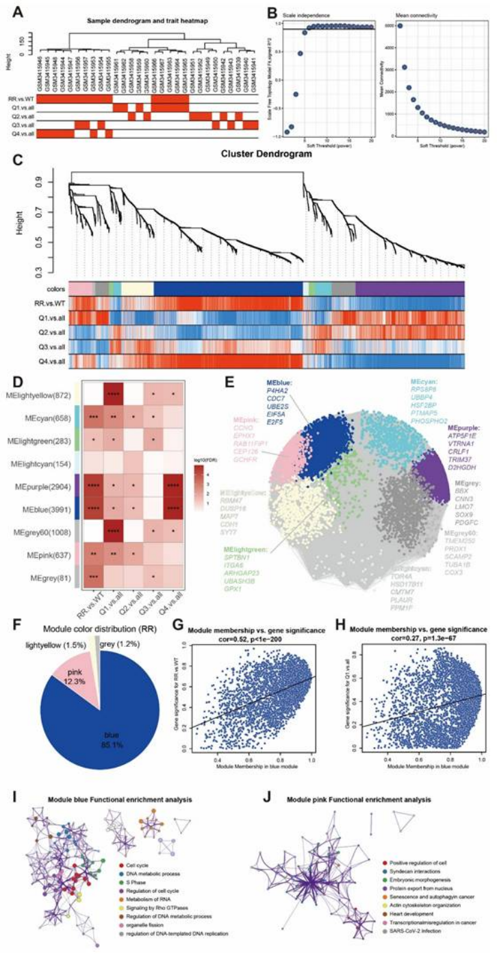 WGCNA 验证:P4HA2 与放疗抵抗基因 panel 同属蓝色模块(占比 85.1%),且模块成员与抵抗特征显著相关(cor=0.52,p<1e-200,图 14G)。