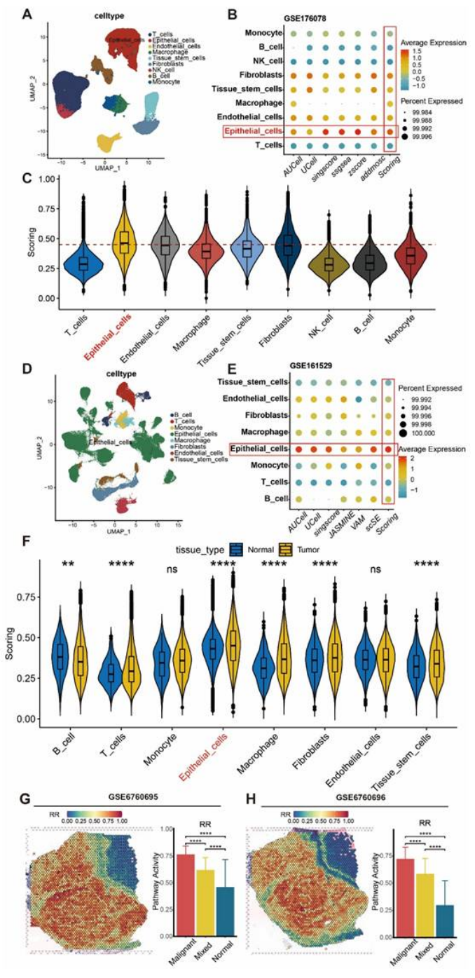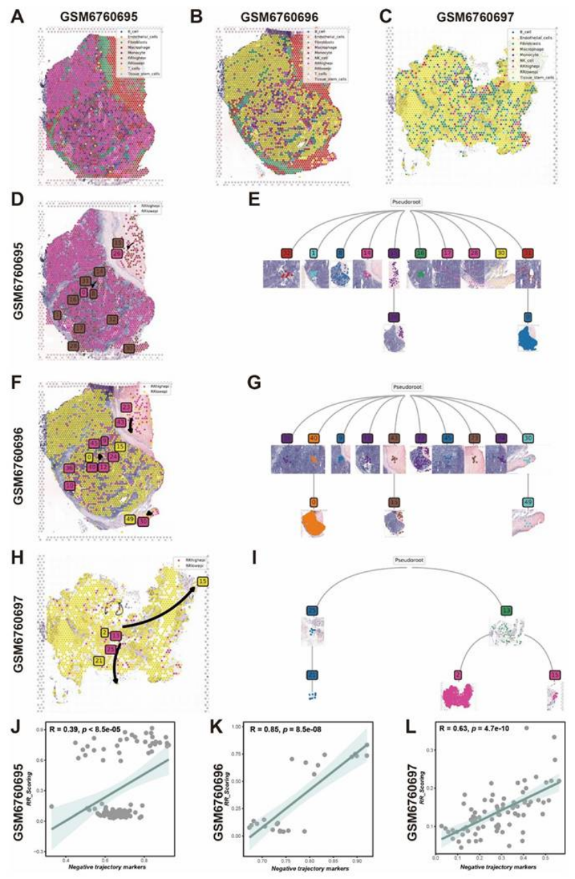 空间定位:空间转录组(GSM6760695-697)显示,RRhighepi 主要集中在肿瘤恶性区域,且与内皮细胞相邻(图 3G-H);