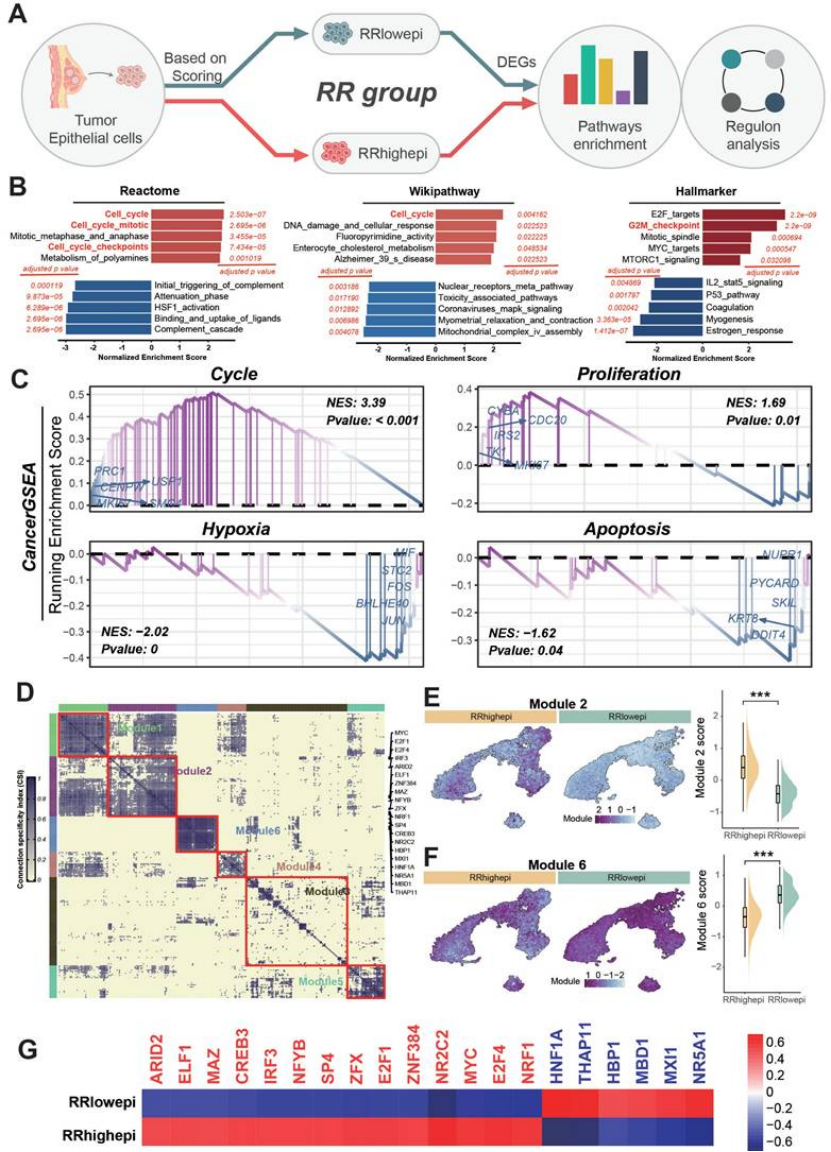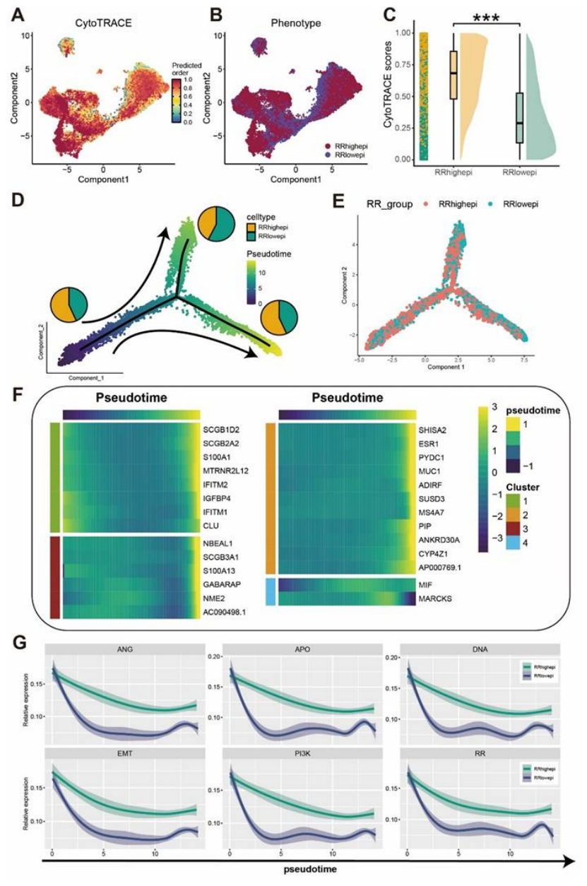 定义 RRhighepi 细胞群:将上皮细胞按评分分为高抵抗(RRhighepi)和低抵抗(RRlowepi),前者富集细胞周期、DNA 损伤修复通路,干性特征显著(图 4B-C);