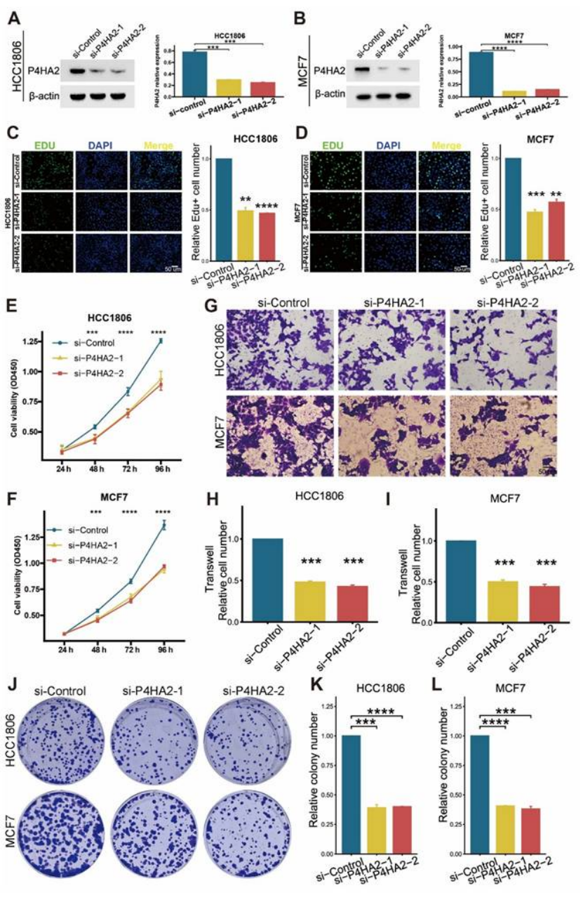 基础功能:敲低 P4HA2 后,HCC1606 和 MCF7 细胞的增殖(EdU assay)、迁移(Transwell)、克隆形成能力均显著降低(图 13C-L);