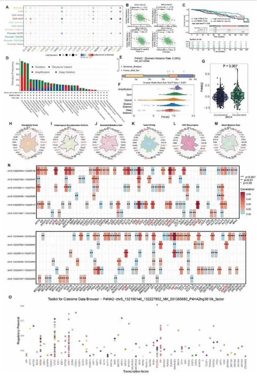分子特征:乳腺癌中 P4HA2 表达与甲基化负相关(图 11B),与基因组不稳定性(非整倍体、HRD 等)正相关(图 11H-L),转录因子 ESR1、BRD4 可能调控其表达(图 11N-O);