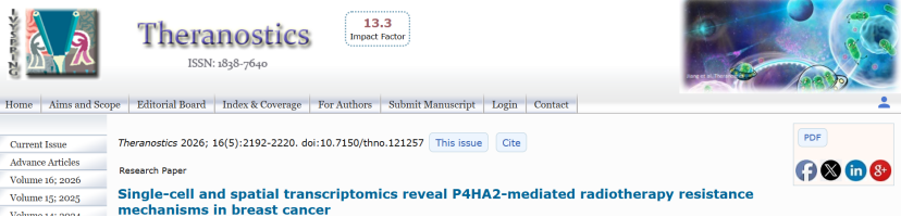 乳腺癌放疗抵抗是临床 Oncology 的“老大难”——HER2 + 亚型抵抗率高,患者复发风险陡增,而核心驱动细胞和分子靶点一直模糊不清。近日,浙江大学第二附属医院、同济大学团队联合在《Theranostics》(顶刊,IF=13.3,0 版面费)发表重磅成果:通过“bulk RNA-seq + 单细胞 + 空间转录组 + 多组学+ 实验验证” 的完整闭环,首次锁定 “高放疗抵抗上皮细胞(RRhighepi)”,挖出核心靶点P4HA2,还构建了能精准分层预后的SSRR 模型,为放疗增敏提供全新方向!