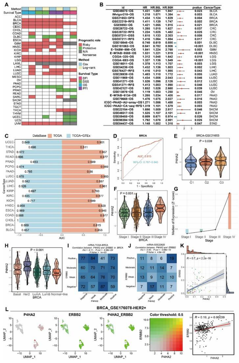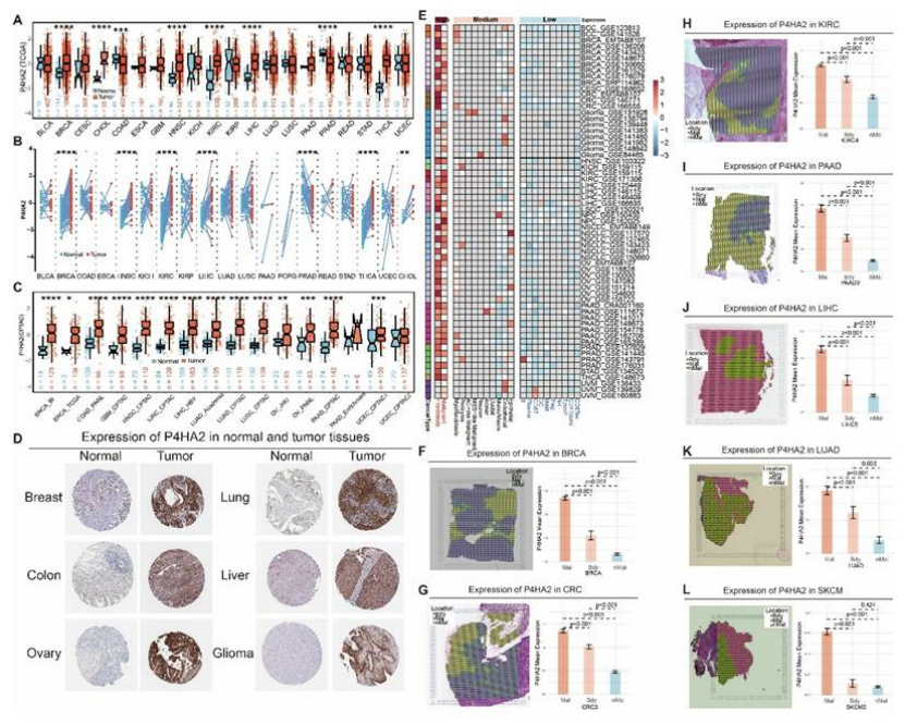 泛癌表达:TCGA 转录组、CPTAC 蛋白质组、IHC 染色均证实,P4HA2 在乳腺癌等多种肿瘤中高表达,且恶性区域表达显著高于正常区域(图 10A-D、F-L);