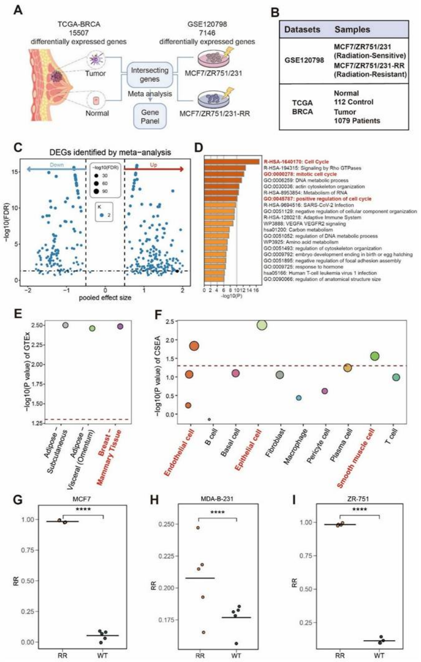 细胞系验证:MCF7、MDAB-231 等放疗抵抗细胞系中,该 panel 的 ssGSEA 评分显著高于敏感株(图 2G-I)。