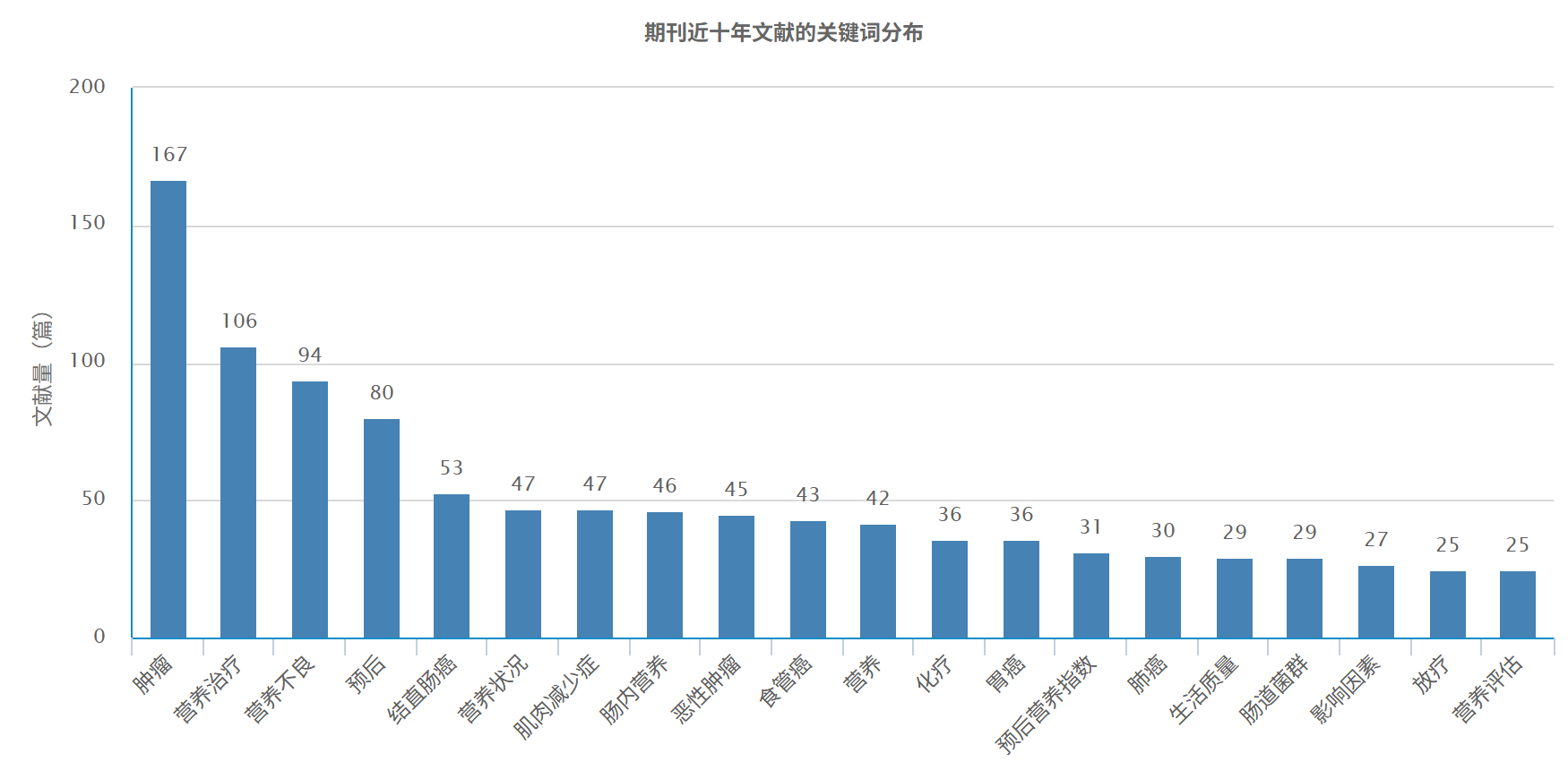 在该期刊中,"肿瘤"栏目的发文量最高,其次是"营养治疗"、"营养不良"、"预后"、"结直肠癌"等。