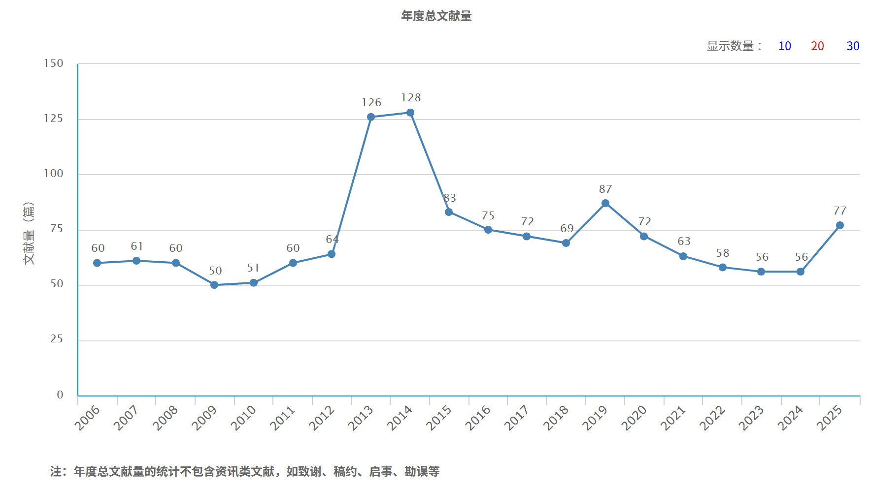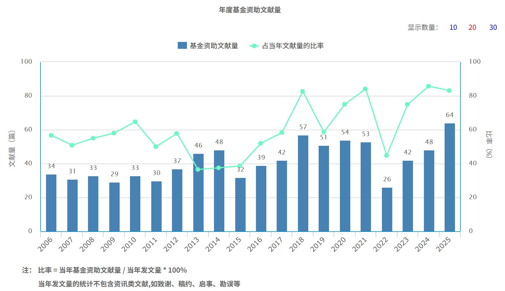 该刊物对基金资助要求逐渐提升,近几年整体约占当年文献量的80%左右,2025年基金资助文章约占发文总量的83.12%。