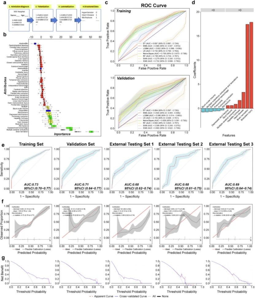 临床文本挖掘(CTM):通过 NLP 提取入院病历中的损伤类型、并发症等 44 项结构化特征(如脑疝、多发性脑挫伤)(图 2a);