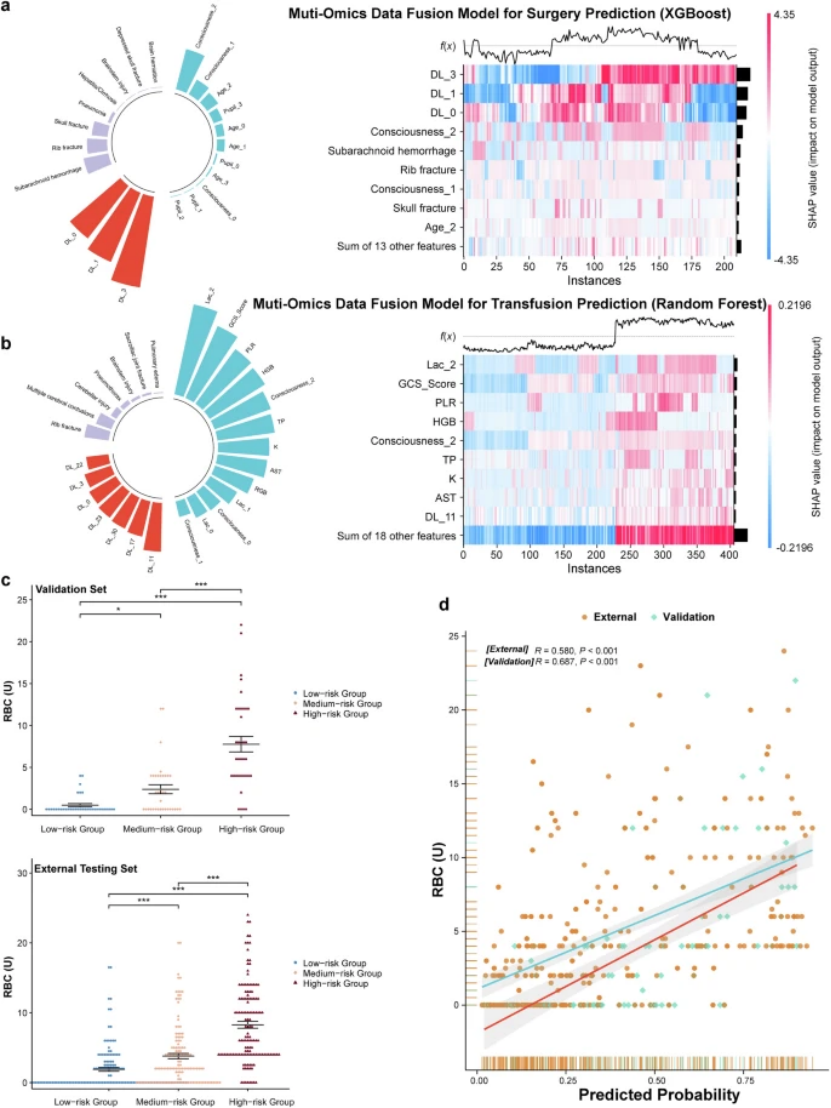 大量输血预测(≥4U RBC):精准预判围手术期输血需求,核心预测因子为乳酸(升高)、GCS 评分(降低)、血红蛋白(降低)(图 8b),且预测概率与实际输血量强相关(验证集 R=0.687,外部集 R=0.580)(图 4d);