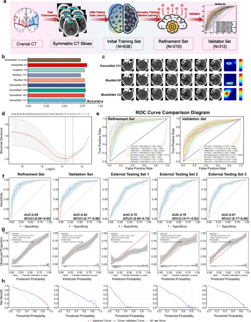神经影像特征(NRI):创新 2.5D 深度学习(MobileNet V2),提取 CT 影像 7 个关键层面特征,Grad-CAM 验证特征与脑出血区域高度重合(图 1c);