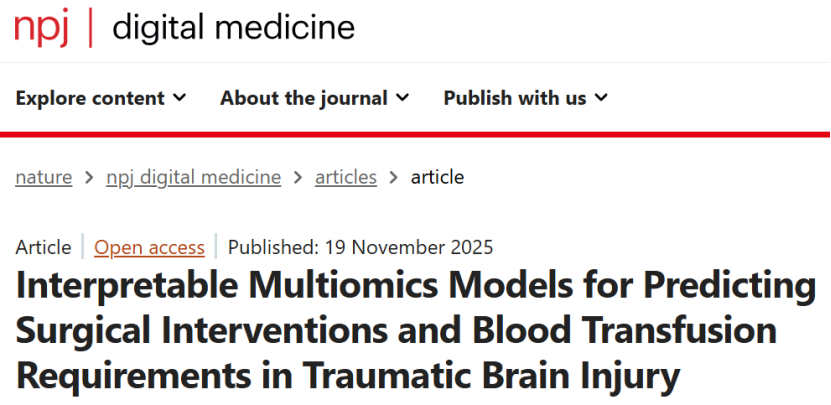创伤性脑损伤(TBI)是全球致死致残的主要原因之一,急诊场景下能否快速判断患者是否需要手术、是否存在大量输血风险,直接关系到救治成功率。但传统决策依赖医生经验,主观性强、误判风险高。近日,北京军事医学科学院团队Deng Jiang等研究者与河北医科大学第二医院麻醉科Deng Tao 等多中心联合攻关,在《npj Digital Medicine》(IF=15.1,数字医学顶刊)发表重磅成果:开发多组学融合(MDF)预测模型,整合临床生物标志物、神经影像特征、临床文本挖掘三维数据,实现 TBI 患者手术干预与输血需求的精准预测,多中心2219 例样本验证,提前3 小时给出决策建议,为急诊救治争取关键时间!