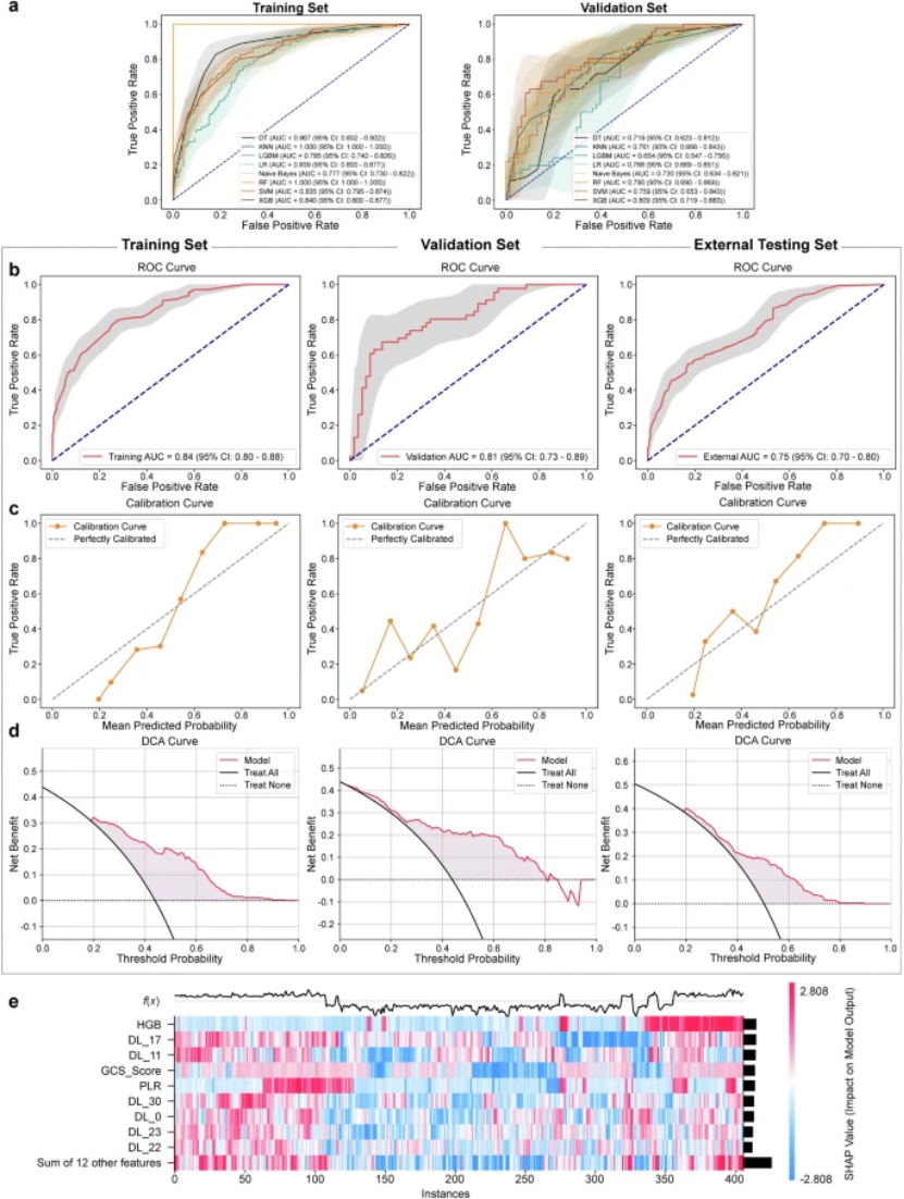 性能稳定:验证集 AUC 0.81,外部集 AUC 0.75,决策曲线分析显示临床净获益显著(图 5b-d);