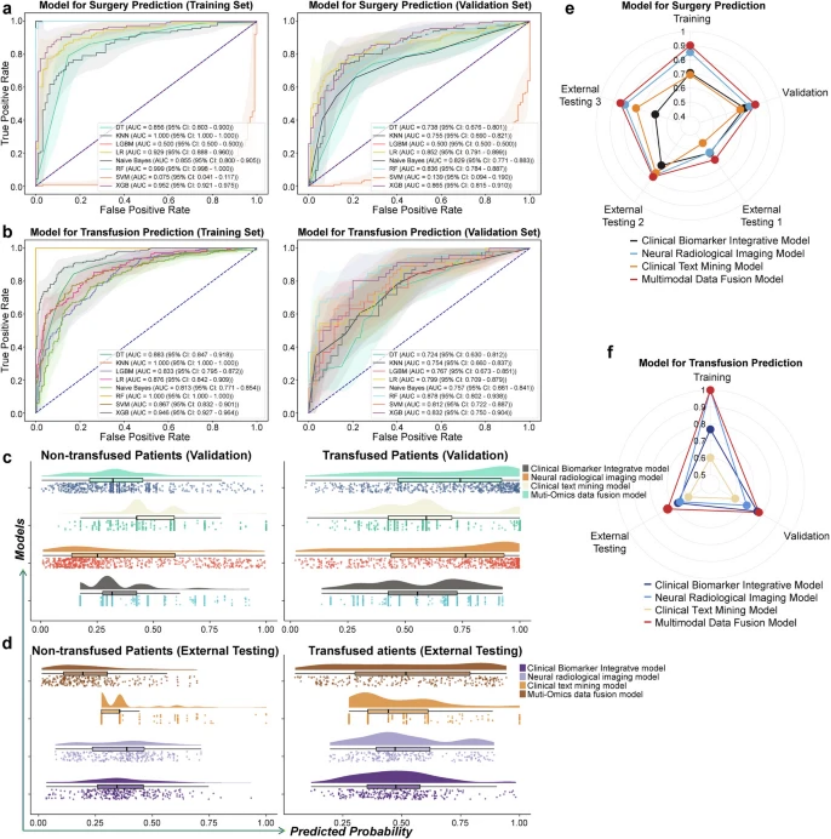 验证结果:手术预测外部验证 AUC 0.70-0.82,输血预测外部 AUC 0.74,且在不同年龄、性别亚组中性能稳定(图 3e-f);