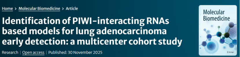 低剂量计算机断层扫描(LDCT)是肺癌早筛的核心手段,但高假阳性率常引发过度诊疗。近日,国家癌症中心团队在《Molecular Biomedicine》(IF=10.1)发表多中心队列研究,首次构建基于 piR-hsa-8393202 和 piR-hsa-8429916 的双 piRNA 诊断模型,不仅对早期肺腺癌(LUAD)诊断 AUC 达 0.918,还能精准区分 LDCT 检出的不确定肺结节良恶性,为肺癌早筛提供了兼具特异性与可及性的分子辅助工具!