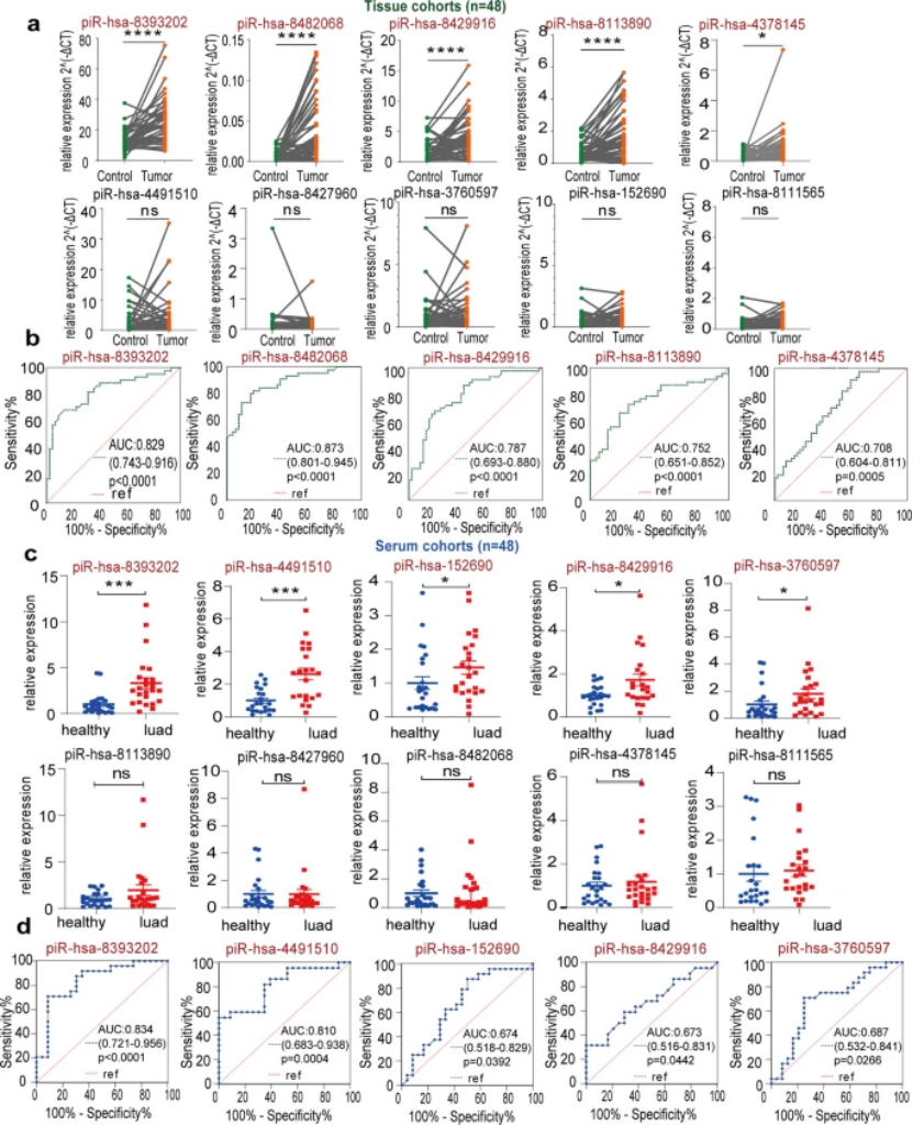 院内队列验证:在 48 对 LUAD 组织和 48 例血清样本中验证发现,仅piR-hsa-8393202和piR-hsa-8429916在组织与血清中均显著高表达(图 3a、c),且组织层面 AUC 分别达 0.829 和 0.787,血清层面 AUC 达 0.834 和 0.674(图 3b、d),具备肿瘤源性和临床诊断潜力。