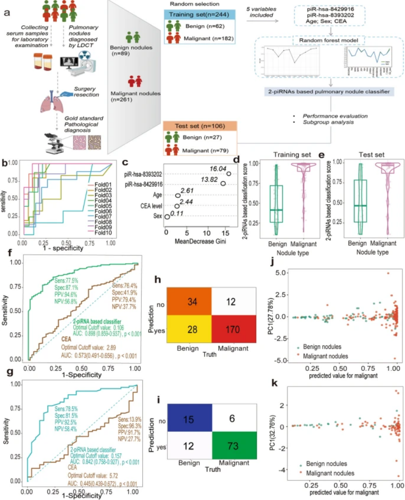 结节分层模型构建:纳入 350 例 LDCT 检出肺结节患者,结合双 piRNA、年龄、性别及 CEA 构建分类模型,十折交叉验证 AUC 达 0.885(图 5b)。