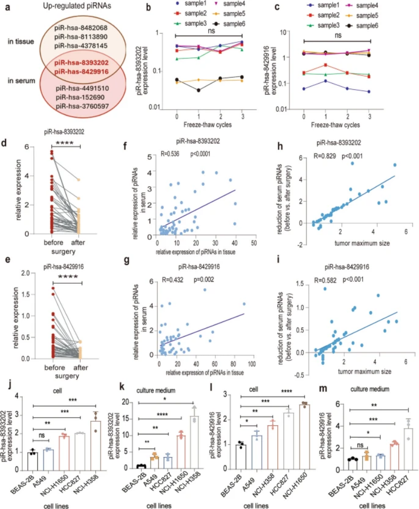 肿瘤源性验证:48 例 LUAD 患者术后血清中双 piRNA 水平较术前显著下降(图 7d、e),且血清表达量与肿瘤体积正相关(图 7h、i);LUAD 细胞系及培养上清中双 piRNA 表达量显著高于正常支气管上皮细胞(图 7j-m),证实其为肿瘤细胞主动分泌的循环标志物。