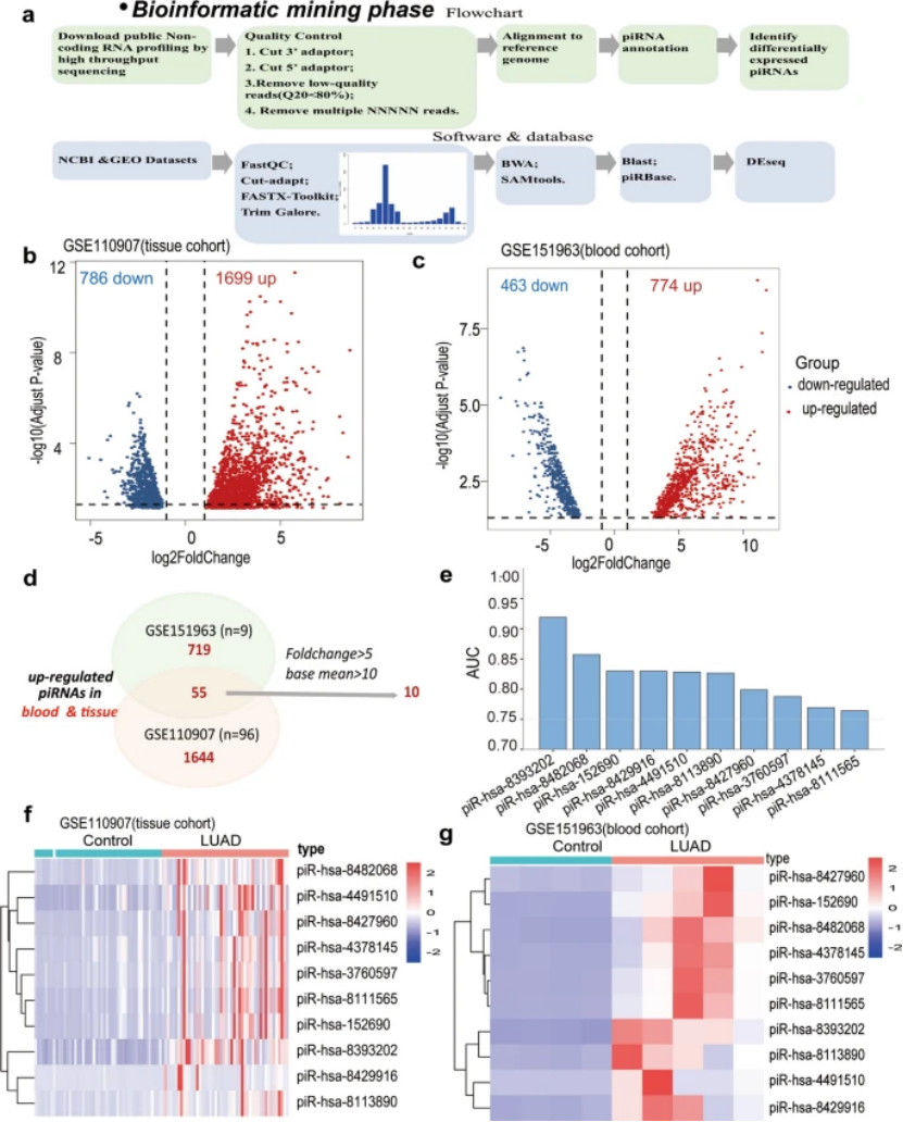 公共数据库挖掘:整合 GEO 数据库 48 对 LUAD 组织 / 癌旁样本及 9 例血清样本的 piRNA 表达谱,筛选出 55 个组织与血清共上调的 piRNA(图 2d),经严格阈值过滤得到 10 个候选分子(图 2e-g)。