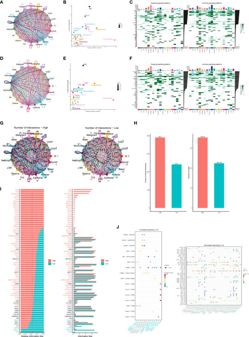 免疫微环境关联:细胞通讯分析(CellChat)发现,PTGES3 高分组的肿瘤细胞与巨噬细胞、成纤维细胞的交互更强(图 4G-H),VEGFA-VEGFR、SPP1-CD44 等促血管生成、转移的信号轴更活跃(图 4J)—— 解释了 “为什么 PTGES3 高表达预后差”,机制更立体。