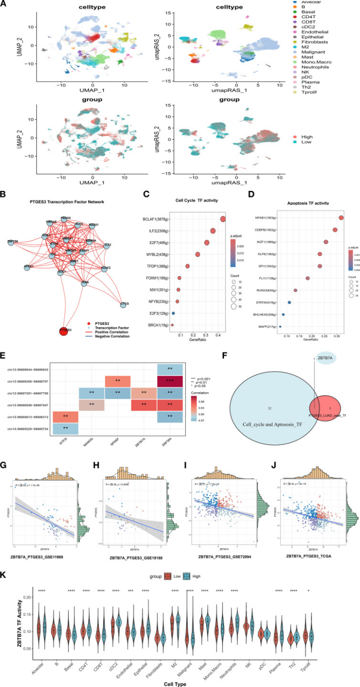 上游机制明确:用 SCENIC+ATAC-seq 找到 PTGES3 的关键转录调控因子 ZBTB7A,双荧光素酶报告实验验证两者的调控关系(补充图 3G),且 ZBTB7A 低表达会导致 PTGES3 升高,进一步促癌(图 6G-K)。