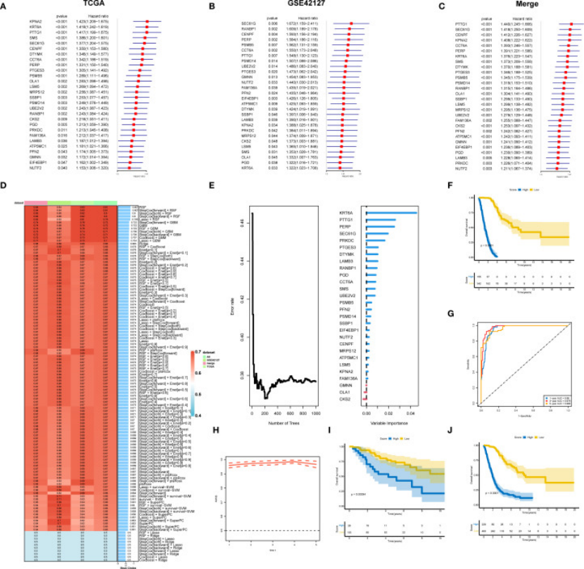 10 种算法选 “最优解”:测试 Lasso、随机生存森林(RSF)、XGBoost 等 10 种常用算法,最终 “RSF 算法” 表现最好 —— 训练集 C 指数达 0.94,验证集平均 C 指数≈0.7,28 个基因中 PTGES3、KRT6A 等重要性最高(图 1D-E);