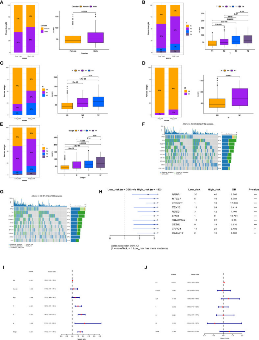 贴临床特征:LS 高分组患者的 T/N/M 分期更晚(图 2B-D),TP53、TTN 等突变率更高(图 2F-G)—— 直接把 “评分” 和 “病情严重程度” 挂钩,临床意义一目了然。