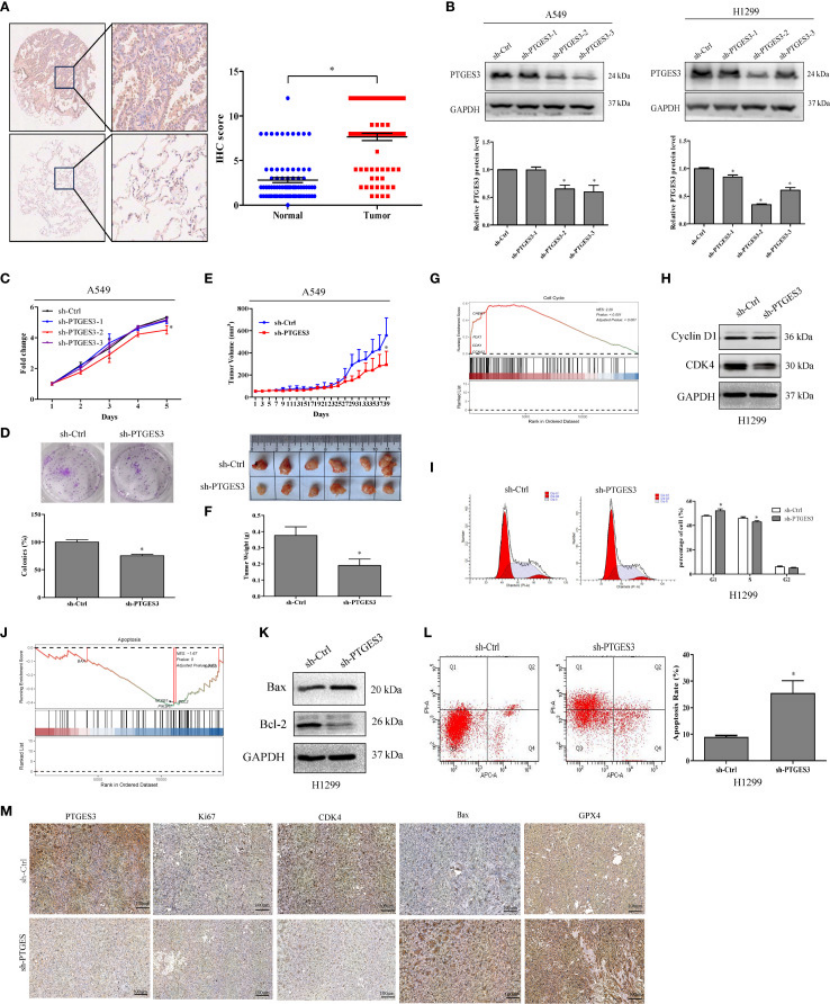 把敲低 PTGES3 的 H1299 细胞皮下接种到裸鼠,结果肿瘤体积更小、重量更轻(图 5E-F),IHC 显示肿瘤中 Ki67(增殖 marker)降低、Bax 升高(图 5M)—— 直接证明 “抑制 PTGES3 能抗 LUAD”;