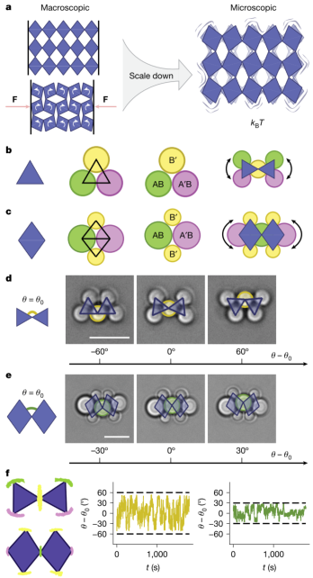 图1 | 热机械超材料的构建单元。 a. 将机械超材料(如旋转钻石晶格)转化到微观尺度,需要构建由铰链键连接的刚性单元,在此尺度下,热涨落而非外力驱动结构变形。b, c. 我们通过在钻石的每个角上放置胶体关节,实验实现了铰接的三角形(b)和菱形(c)单元。使用两种尺寸的胶体球和两对表面可移动的DNA连接子(用A-A'和B-B'表示),以确保单元的机械刚性,同时允许铰链运动。d, e. 明场显微镜快照显示,成对的铰接三角形(d)和菱形(e)单元的相对开合角存在随机涨落。f. 通过定量图像分析,我们提取了所有粒子相对于质心随时间的位置(左)以及开合角的随机变化,该变化在几何允许范围内波动(虚线)。比例尺,5 μm。