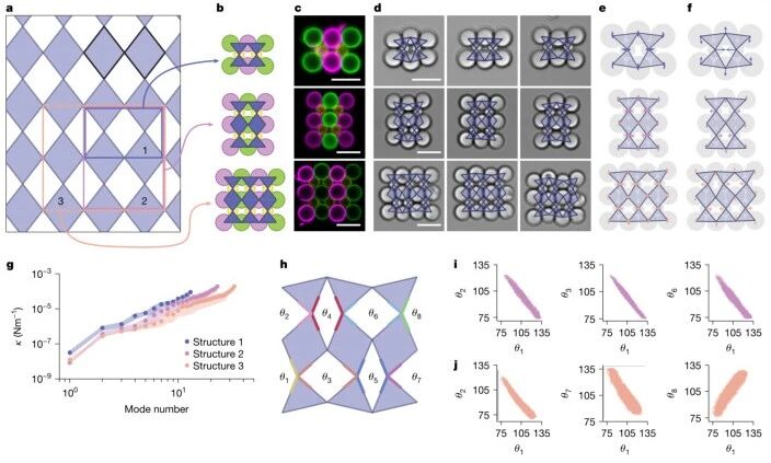 图2 | 胶体机制:旋转钻石结构。 a. 旋转钻石晶格,铰链单元用黑色标示。b. 晶格的不同子集被转化到胶体铰链系统。c. 共聚焦图像显示实验实现,不同颜色表示不同的连接子组合。d. 明场显微镜快照显示通过热涨落实现的结构柔性,中间列为未变形状态,左右两列分别为沿模式相反方向变化的示例。e. 提取的随时间变化的位置(已校正全局旋转和平移),用于模式分析。f. 所有三个结构都有一个单一的软模,即刚性单元的反向旋转。g. 模式谱显示,该模式的刚度比第二软的模式小一个数量级。h-j. 不同开合角的相关性显示出优异的正相关和反相关,如结构2(i)和3(j)所示,证明了拉胀行为所预期的反向旋转运动。g中的阴影区域代表标准差。比例尺,5 μm。